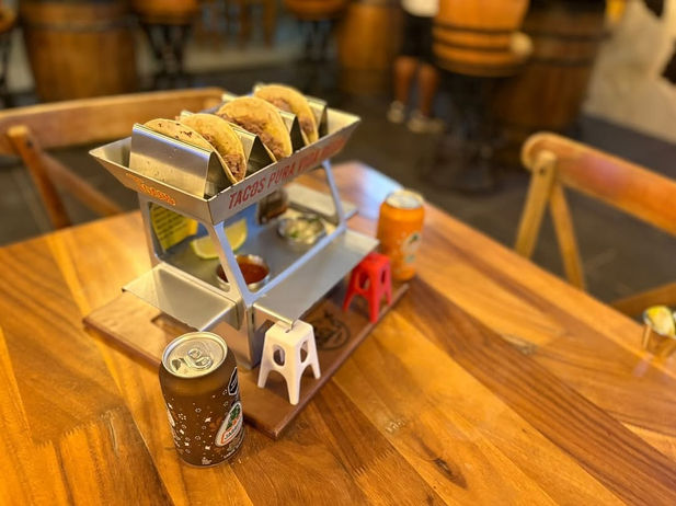 Fabricada en acero al carbón, con pintura electrostática, decoraciones en vinil , incluye 2 salseros, 1 charola y opción a cambio por portatacos para 3 tacos 1 banco, incluimos una base de madera de triplay para proteger tus mesas con tu logo grabado